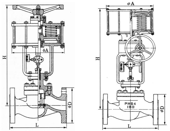 本系列產(chǎn)品有薄膜式、活塞式兩種。閥體結(jié)構(gòu)有單座、套筒、雙座(二位三通)三種,密封形式有填料密封和波紋管密封兩種,產(chǎn)品公稱壓力等級有PN10、16、40、46四種,公稱口徑范圍DN20~200mm。適用流體溫度由-60~450℃。泄漏量等級為IV級或VI級。流量特性為快開。