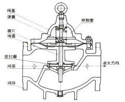 當(dāng)管道從進(jìn)水端給水時(shí),由于針閥、球閥、浮球閥是常開的,水通過微型過濾器、針閥、控制室、球閥、浮球閥進(jìn)入水池,此時(shí)控制室不形成壓力,主閥開啟,水塔(池)供水。當(dāng)水塔(池)的水面上升至設(shè)定高度時(shí),浮球浮起關(guān)閉浮球閥,控制室內(nèi)水壓升高,推動(dòng)主閥關(guān)閉,供水停止。當(dāng)水面下降時(shí),浮球閥重新開啟,控制室水壓下降,主閥再次開啟繼續(xù)供水,保持液面的設(shè)定高度。