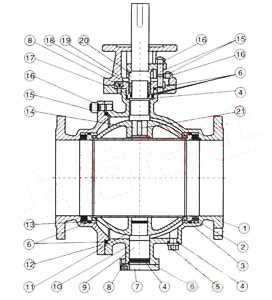 本閥有二塊式和三塊式兩種閥體結(jié)構(gòu),中法蘭用螺栓連接,密封采用增強(qiáng)聚四氟乙烯鑲?cè)氩讳P鋼圈內(nèi),鋼圈后部沒有彈簧保證閥座緊貼球體,保持密封。上下閥桿均沒有PTFE軸承,減少磨擦,操作省力,小軸底部沒有調(diào)整片,保證球與密封圈的接處位置。全通徑:閥門流量孔徑與管線內(nèi)徑一致,以便管線清掃。